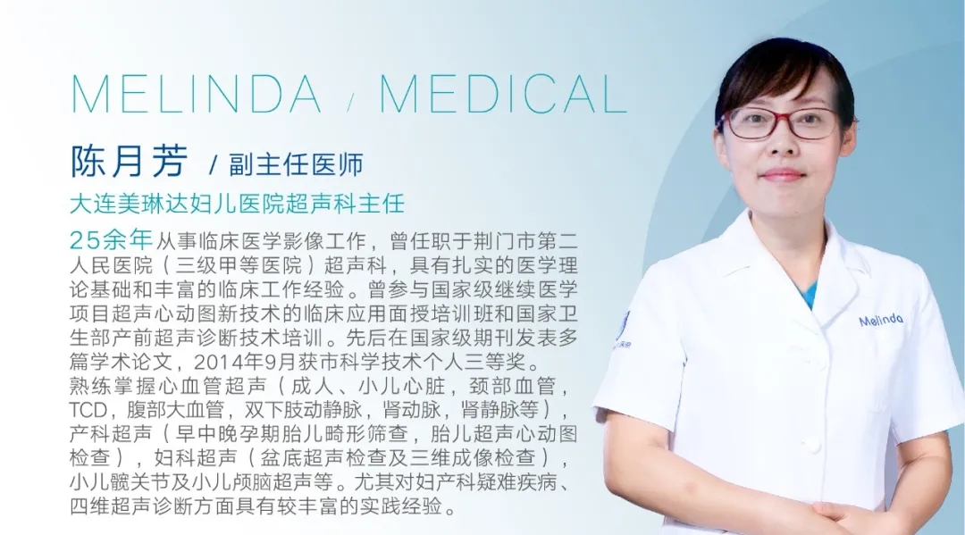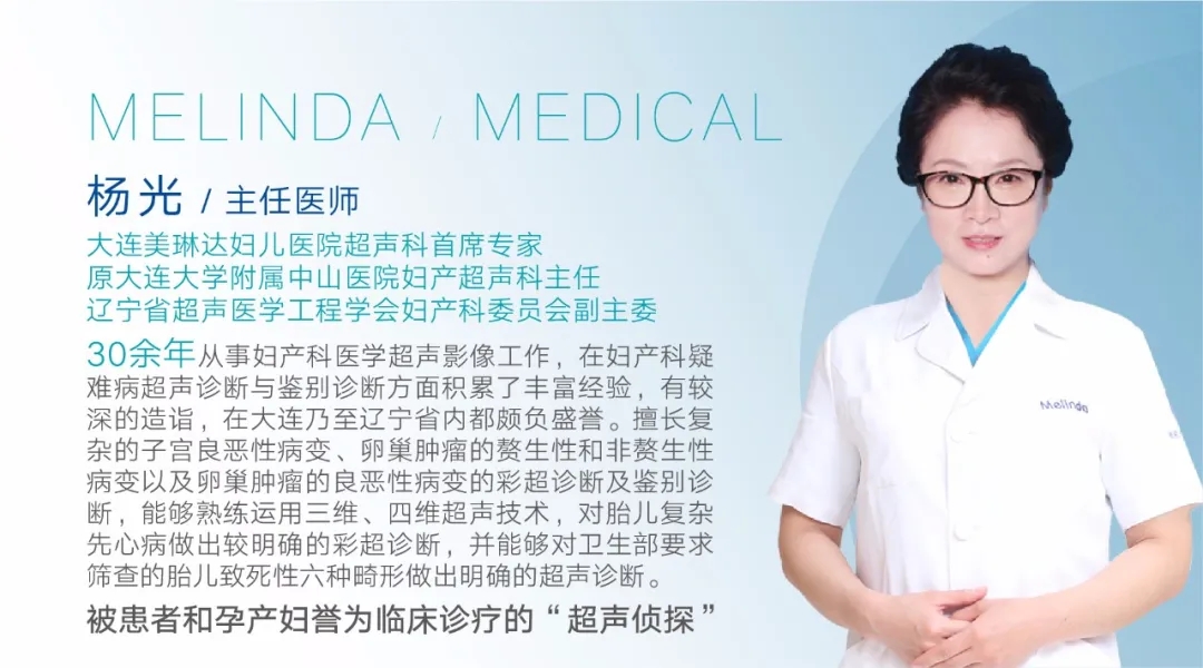 美琳达超声科由原大连大学附属中山医院妇产超声科主任、辽宁省超声医学工程学会妇产科委员会副主委,美琳达妇儿医院超声科首席医生杨光,以及原湖北省三甲医院超声科医生,美琳达四维彩超主任陈月芳领衔。她们平均拥有三十余年妇产科超声经验,在系统超声诊断与鉴别方面技术高超,检查严谨细致,超声业内享有盛誉,深受广大女性及孕妈信赖和认可。